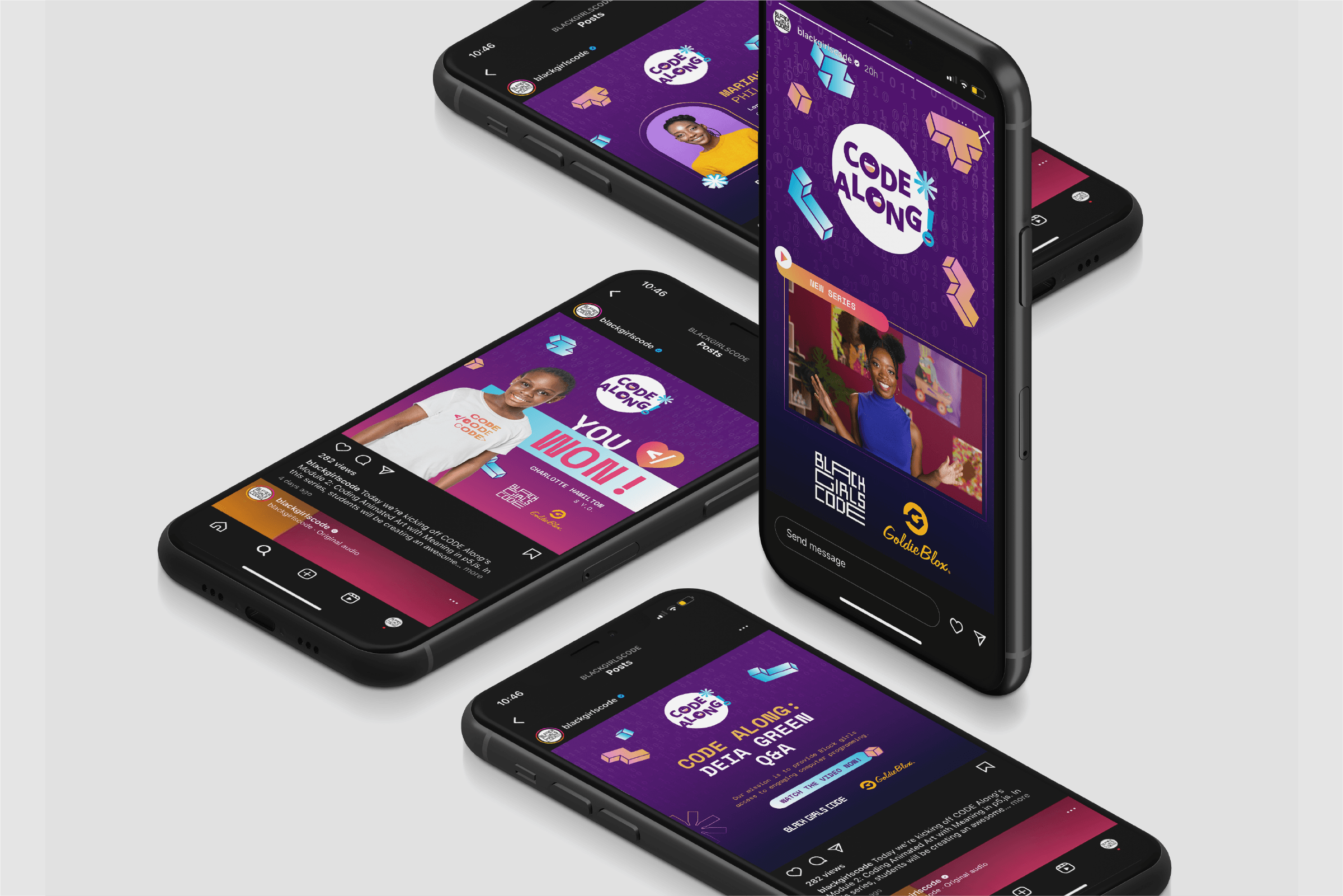 The opportunity to create the branding and messaging for the CODE Along initiative was particularly special because CODE Along is not only a free, video-based coding academy hosted by Black girls and young women that is tangible, educational, and entertaining, but it’s also a partnership between two very cool organizations, Black Girls Code and GoldieBlox. Every CODE Along episode features culturally responsive, gender-conscious, and representative STEM content that can easily be shared.